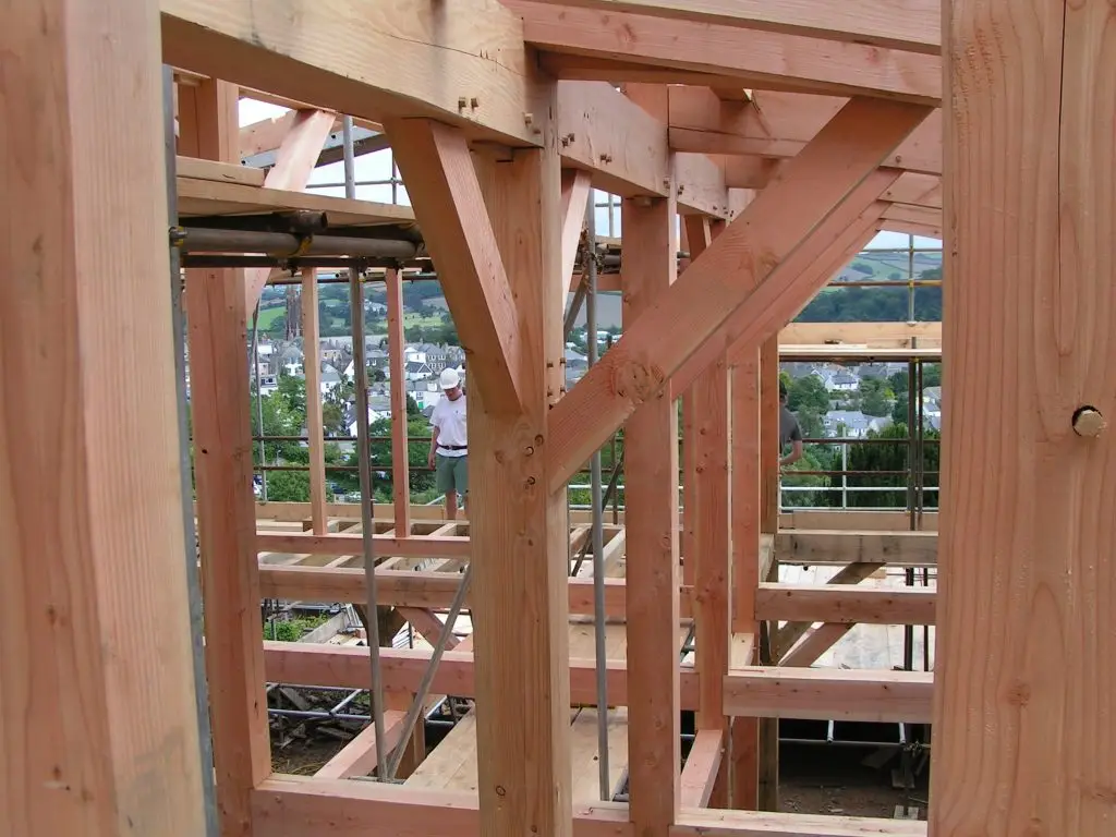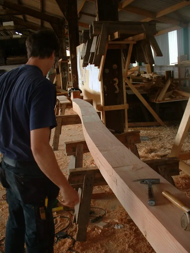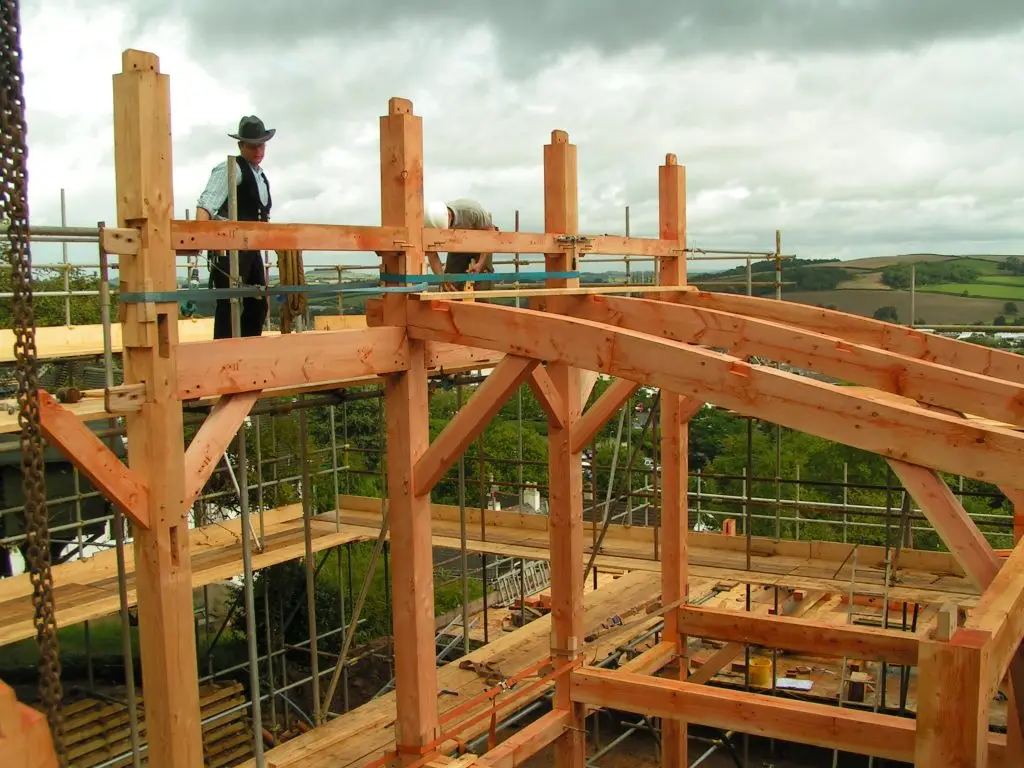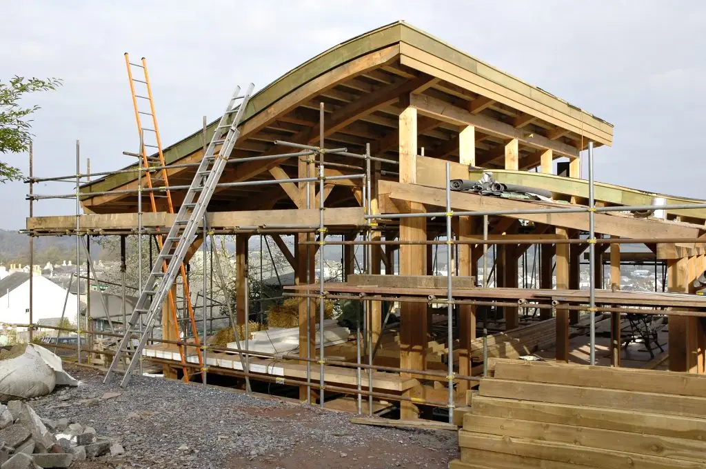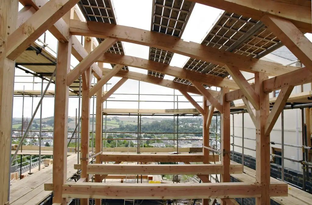 The resulting primary frame is elegant and efficient. It is supported at its base by very deep floor beams fitted to pyramidal staddle stones over micro-pile foundations. The primary frame features traditional oak pegged carpentry joints such as mortice and tenons and wedged through tenons where the tie beams are likely to be in tension under wind loads and the double curved ‘S’ shaped principal rafters that support the common purlin roof structure are jointed then shaped accurately from templates. These are visible within the building and add to the language of the frame design. The Douglas Fir frame has a planed finish and is oiled to protect its surface.