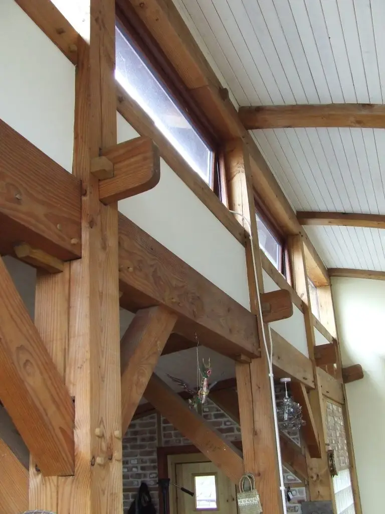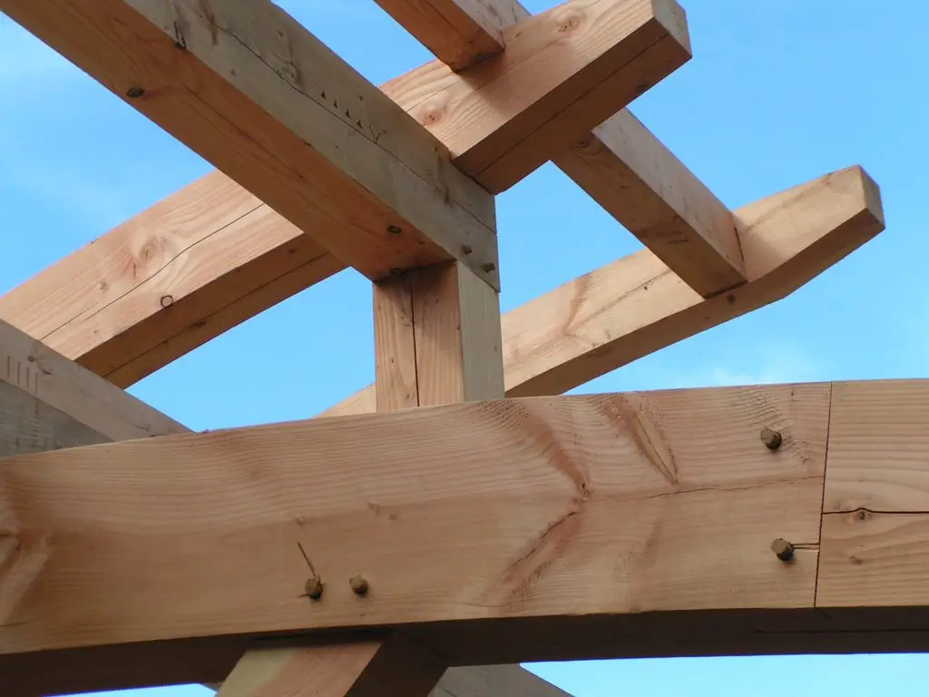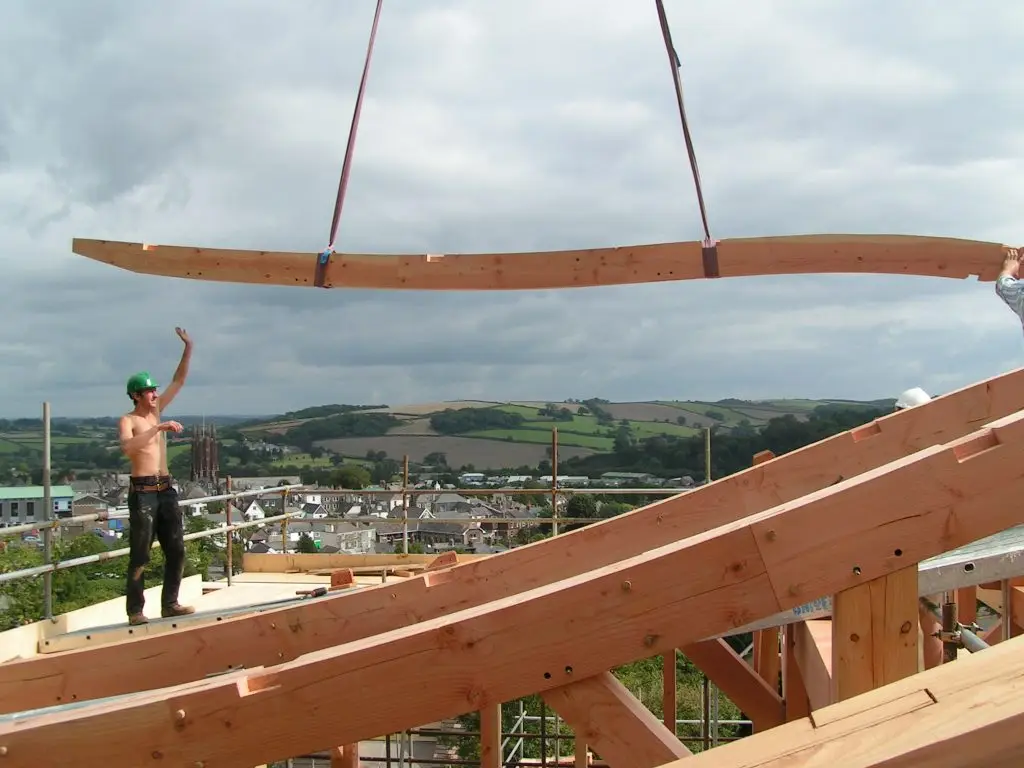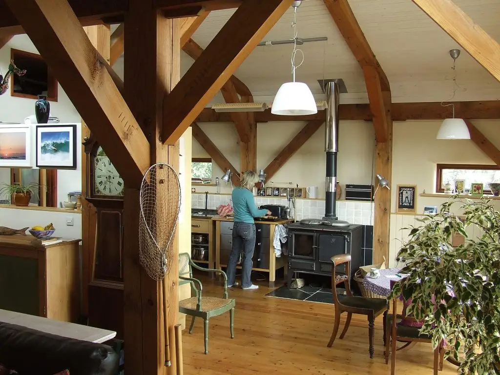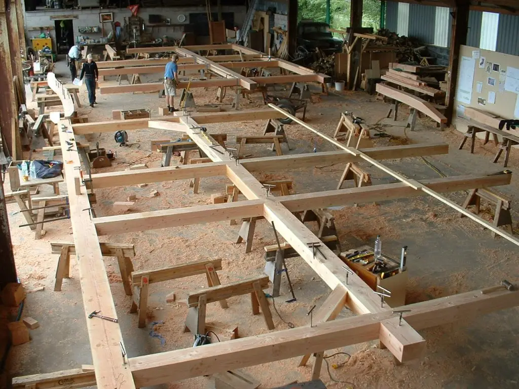 The resulting primary frame is elegant and efficient. It is supported at its base by very deep floor beams fitted to pyramidal staddle stones over micro-pile foundations. The primary frame features traditional oak pegged carpentry joints such as mortice and tenons and wedged through tenons where the tie beams are likely to be in tension under wind loads and the double curved ‘S’ shaped principal rafters that support the common purlin roof structure are jointed then shaped accurately from templates. These are visible within the building and add to the language of the frame design. The Douglas Fir frame has a planed finish and is oiled to protect its surface.
