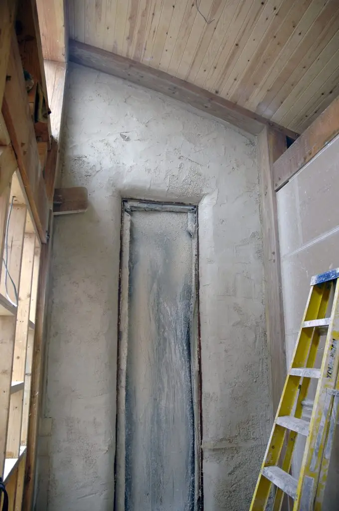 The important aspects of this construction was the minimal use of concrete, and the elevated suspended ground floor level providing a significant undercroft with plenty of airflow to safeguard the timber structure and straw bale from external water ingress from flood or foul weather. Early on in the design process we agreed that the straw bale walls were not to be a supporting element, rather, the braced primary frame would be internally exposed and support the bale walls over cantilevered beams at each floor level and support a simple ‘S’ curved mono pitch purlin roof structure. The bale walls are elevated from the floor levels by a low insulated timber wall frame to ensure protection from any internal flooding from burst pipes or broken washing machines that could cause catastrophic damage to the bale’s structural integrity. This low wall panel was designed to provide an easy access service void, housing the plumbing and electrical services. The floor joists and common purlins were sourced from conventional timber sections, cut and fitted on site by the builders carpentry team.