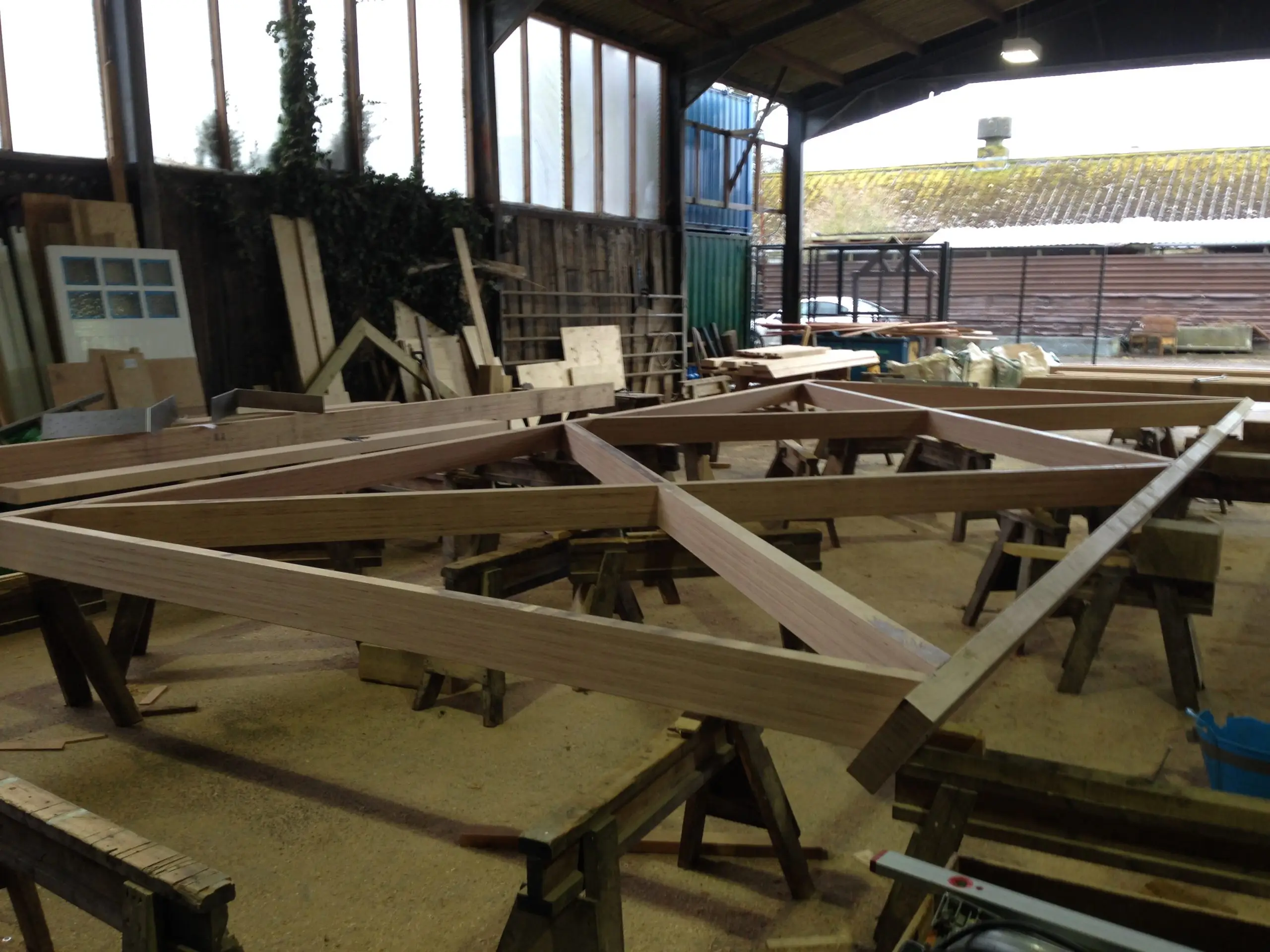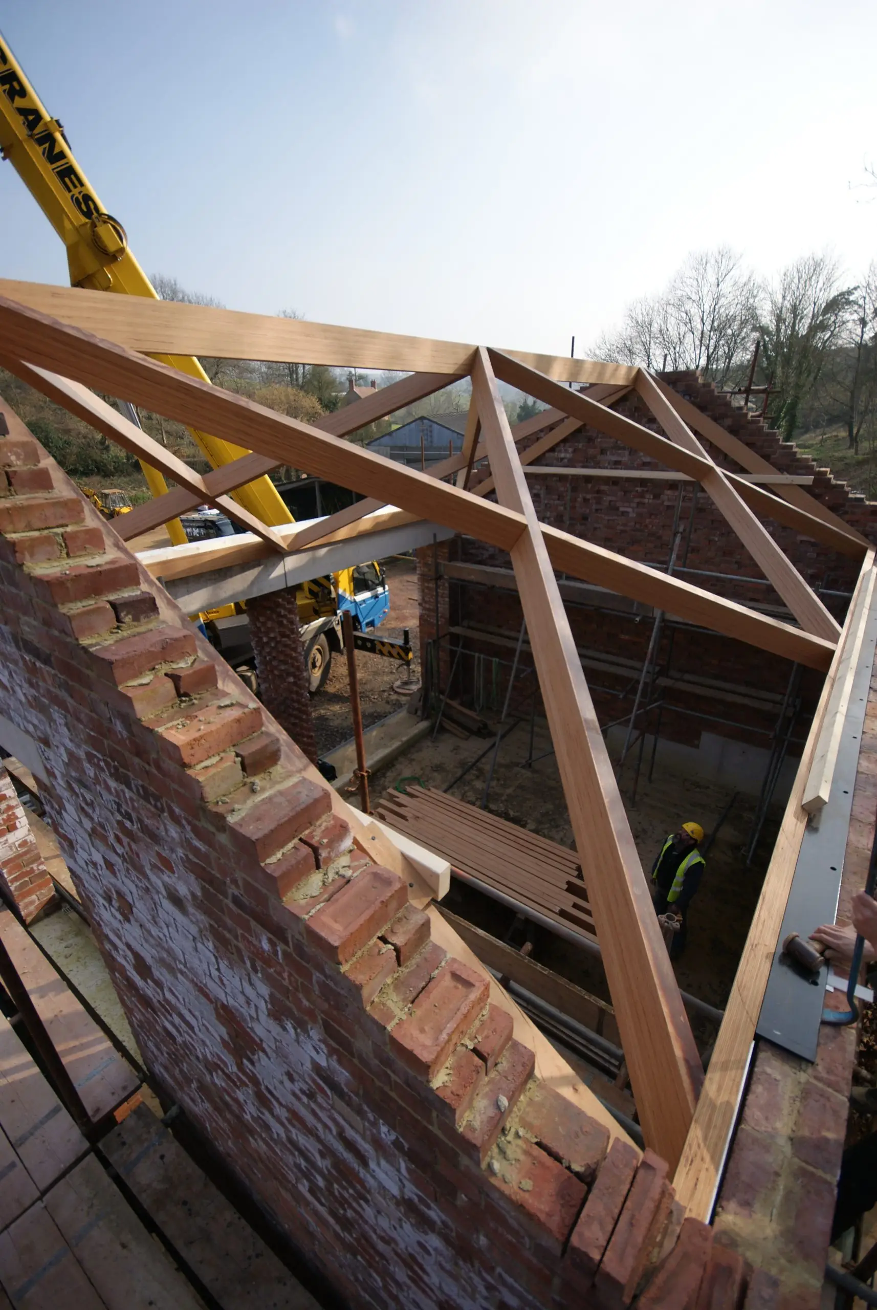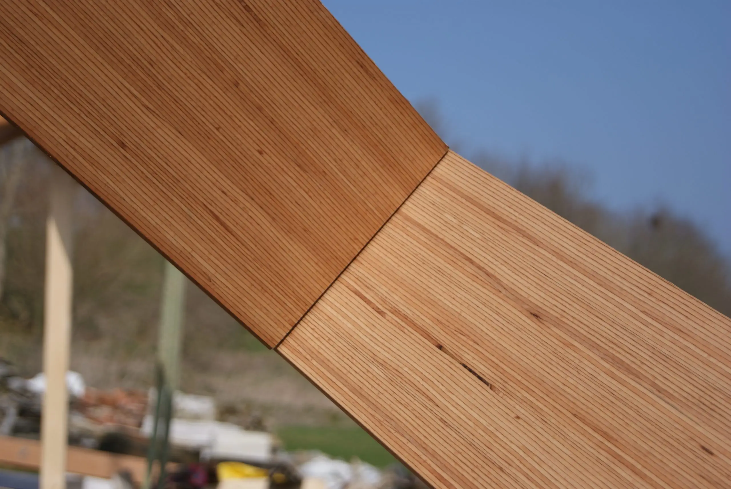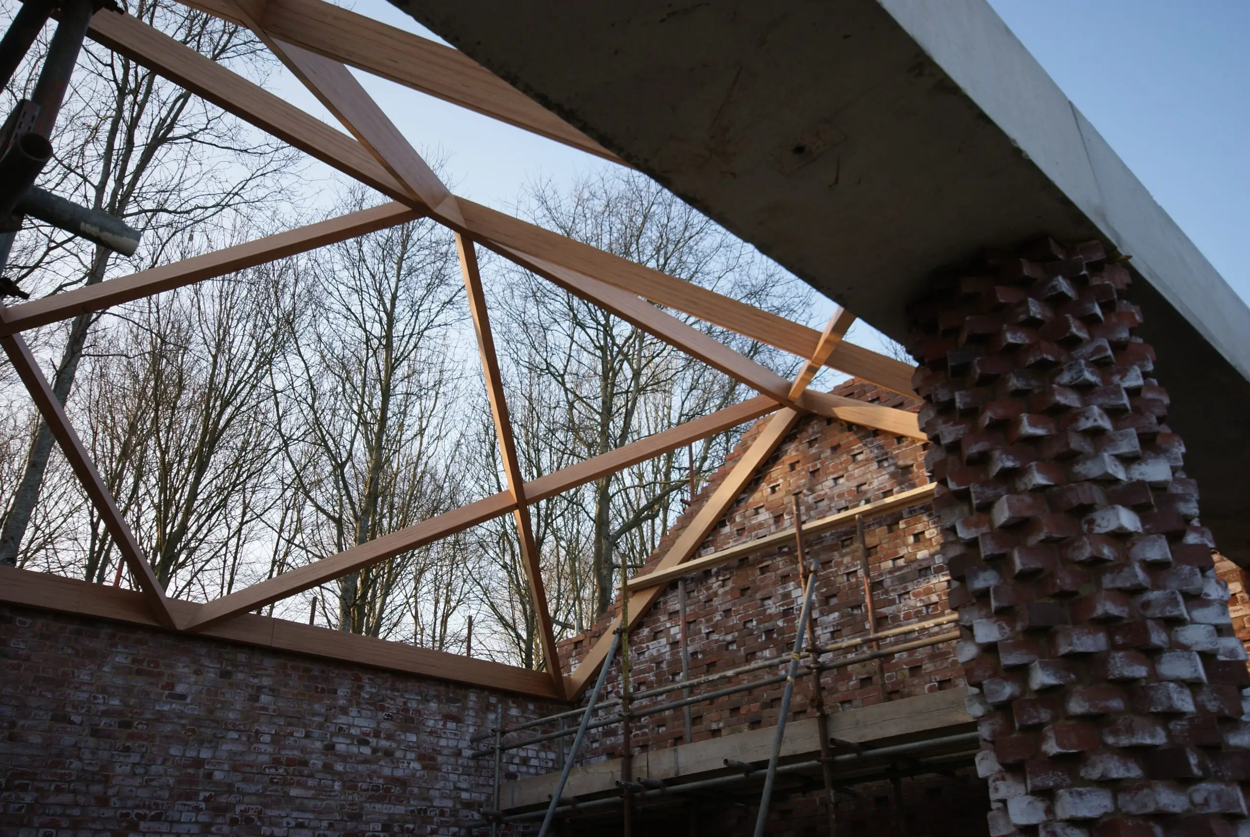 This contemporary diagrid roof frame is made from BauBuche, a beech Laminated Veneer Lumber (LVL) which is an engineered timber product made by Pollmeier in Germany. We were the first company in the UK to use this extraordinary material which is immensely strong and dimensionally stable. Due to the way it’s manufactured it can be supplied in long lengths and different widths; its inherent strength allows unusually slender sections to be used. The frame geometry was cut accurately by hand with power tools. We incorporated modern connection systems that are housed within the ends of each member using pairs of interlocking dovetail plates held with an array of special screws with formed stainless steel corner reinforcement brackets. The timber was supplied with a machine planed finish which we sanded and oiled prior to installation.