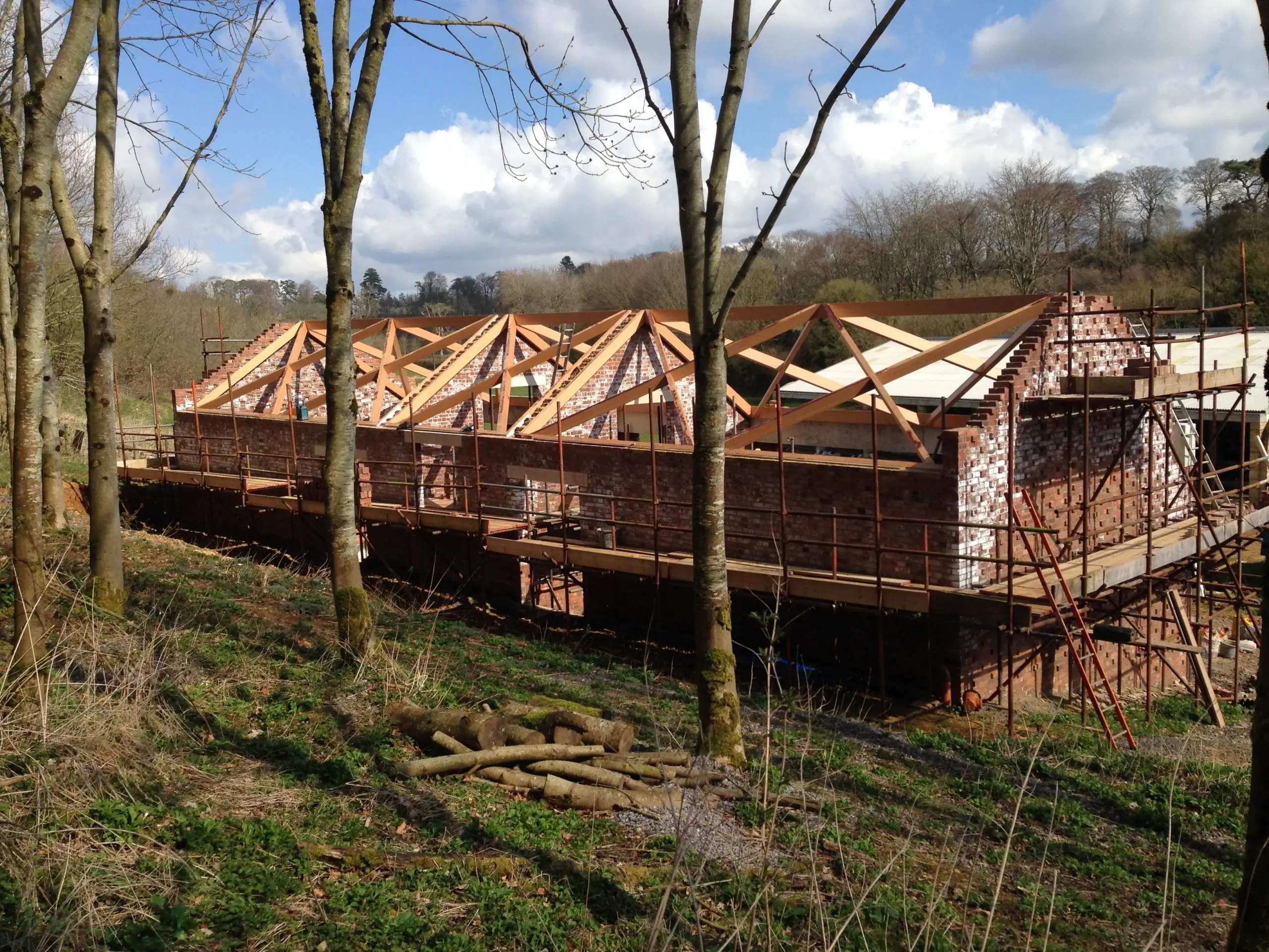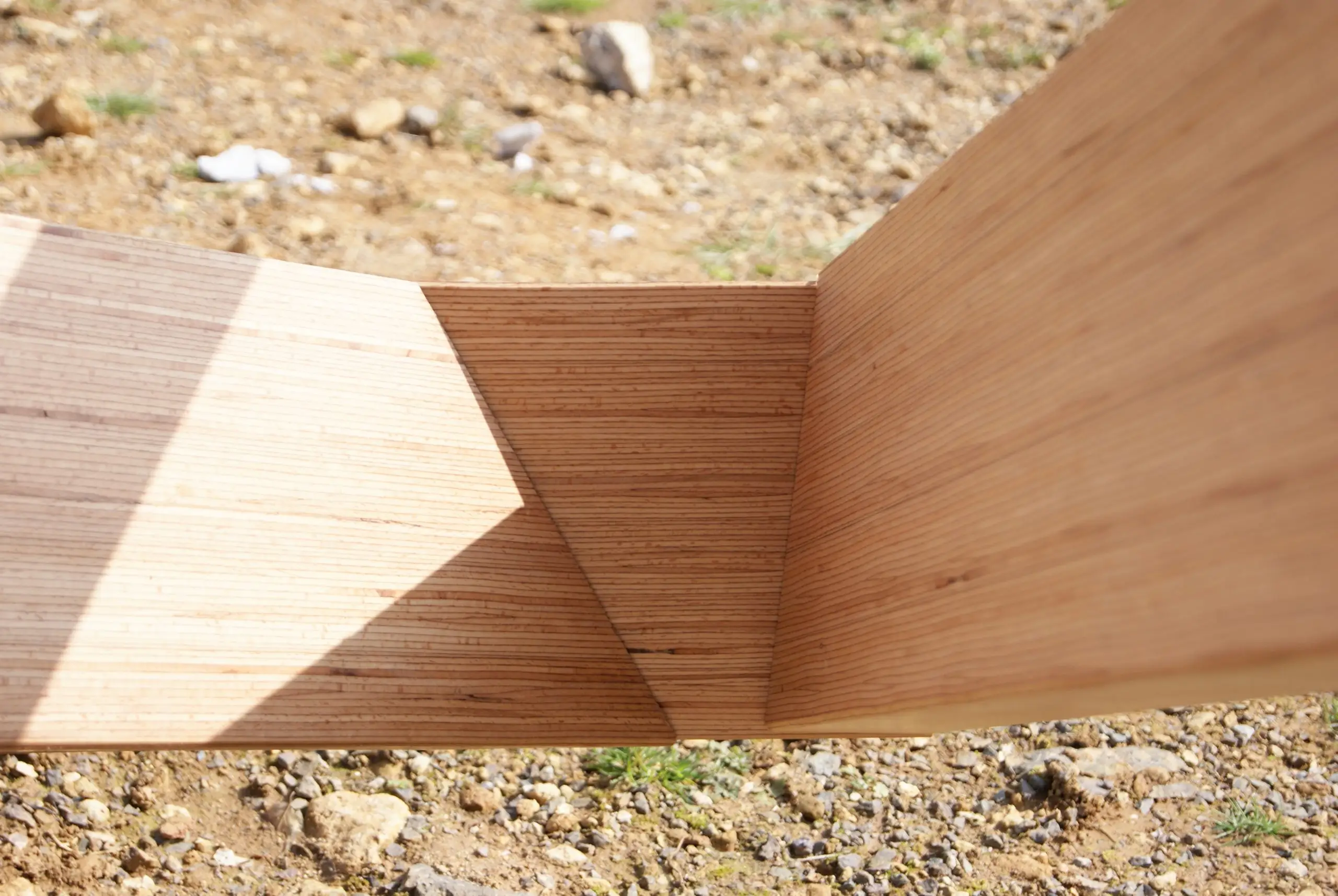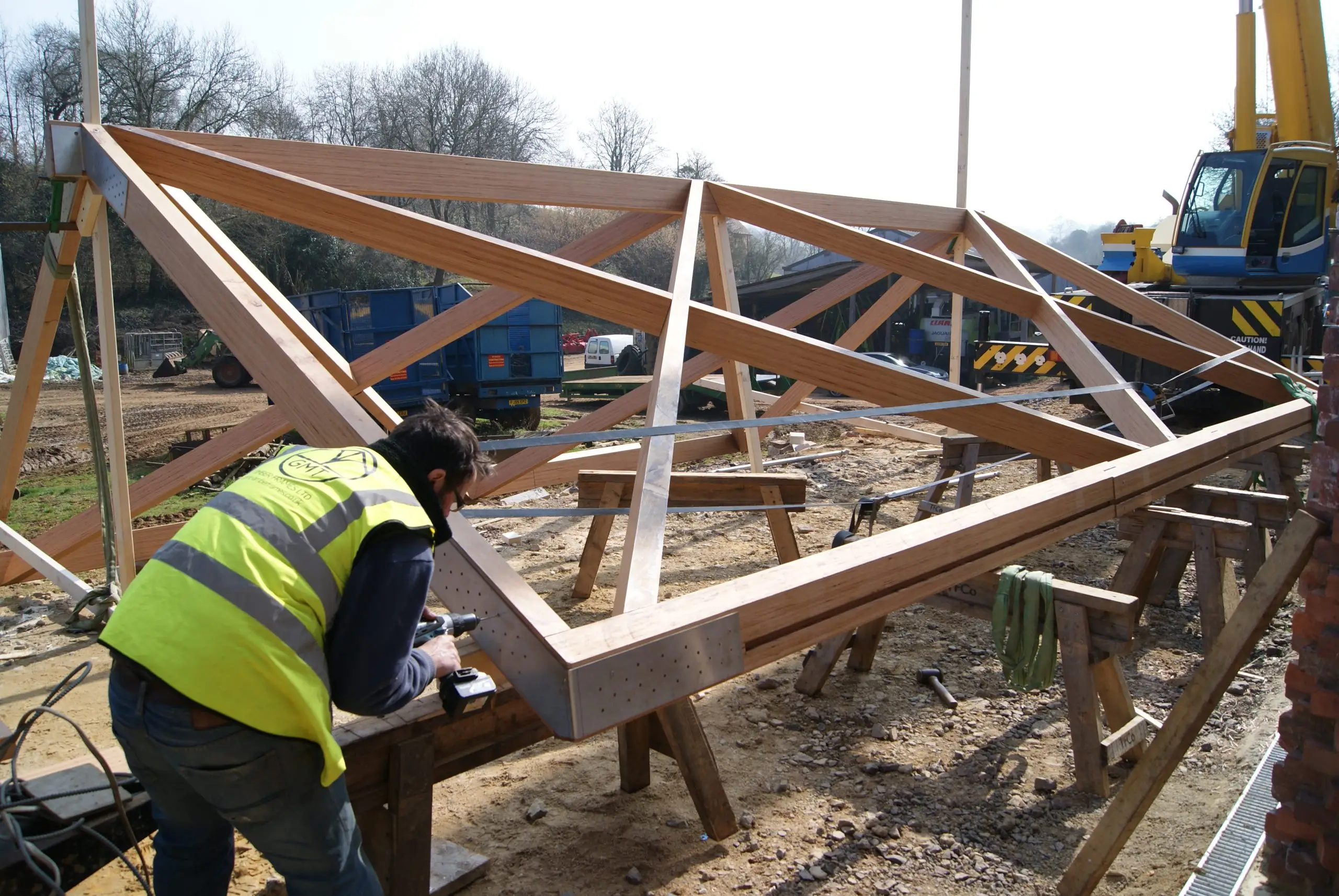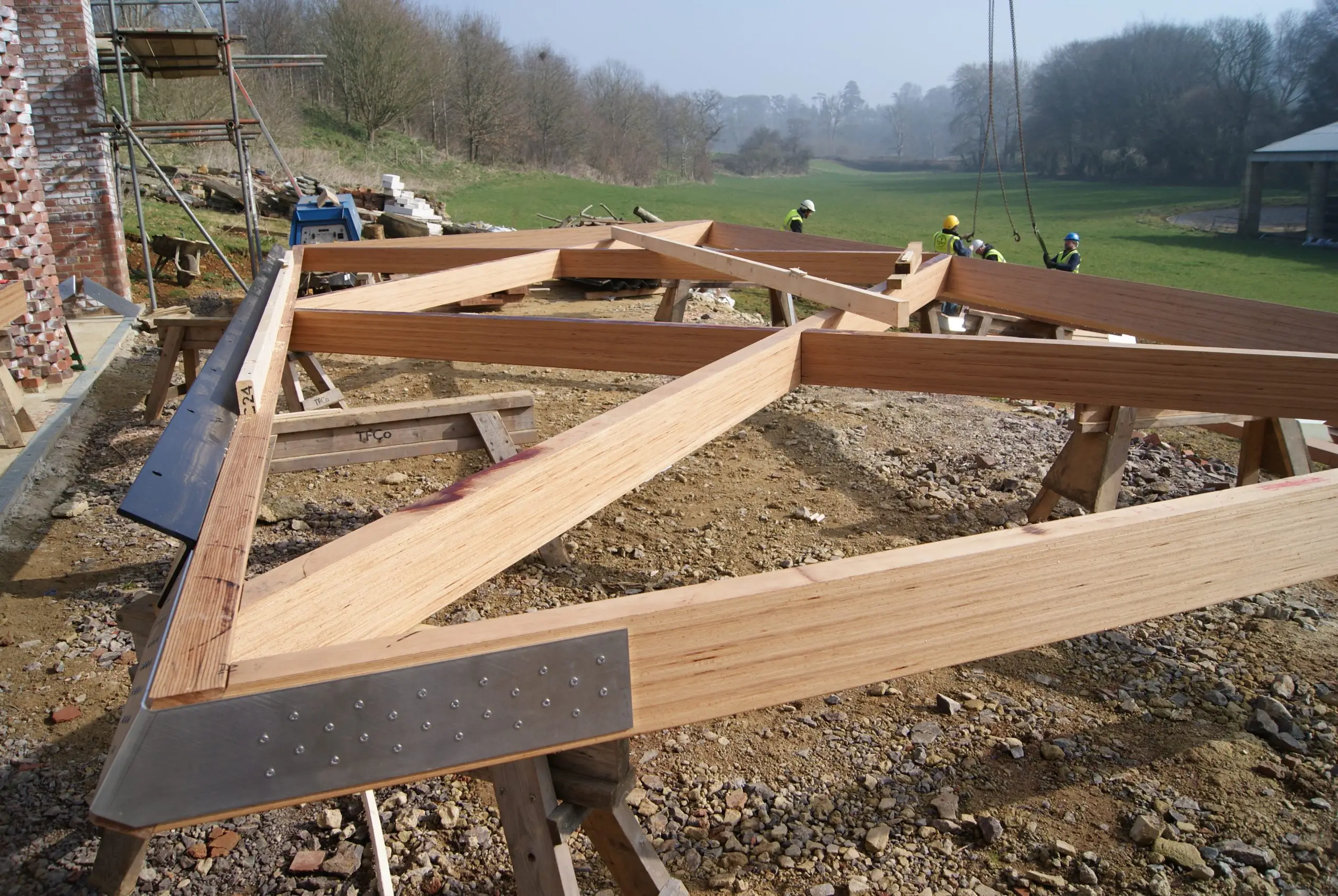 This contemporary diagrid roof frame is made from BauBuche, a beech Laminated Veneer Lumber (LVL) which is an engineered timber product made by Pollmeier in Germany. We were the first company in the UK to use this extraordinary material which is immensely strong and dimensionally stable. Due to the way it’s manufactured it can be supplied in long lengths and different widths; its inherent strength allows unusually slender sections to be used. The frame geometry was cut accurately by hand with power tools. We incorporated modern connection systems that are housed within the ends of each member using pairs of interlocking dovetail plates held with an array of special screws with formed stainless steel corner reinforcement brackets. The timber was supplied with a machine planed finish which we sanded and oiled prior to installation.