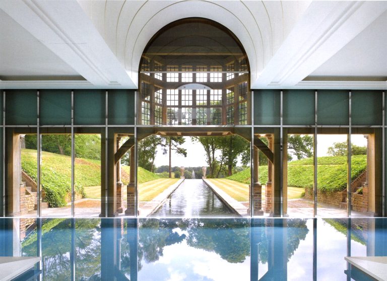 The exterior gable end frame that will be glazed, including a pair of large French doors to the garden beyond.