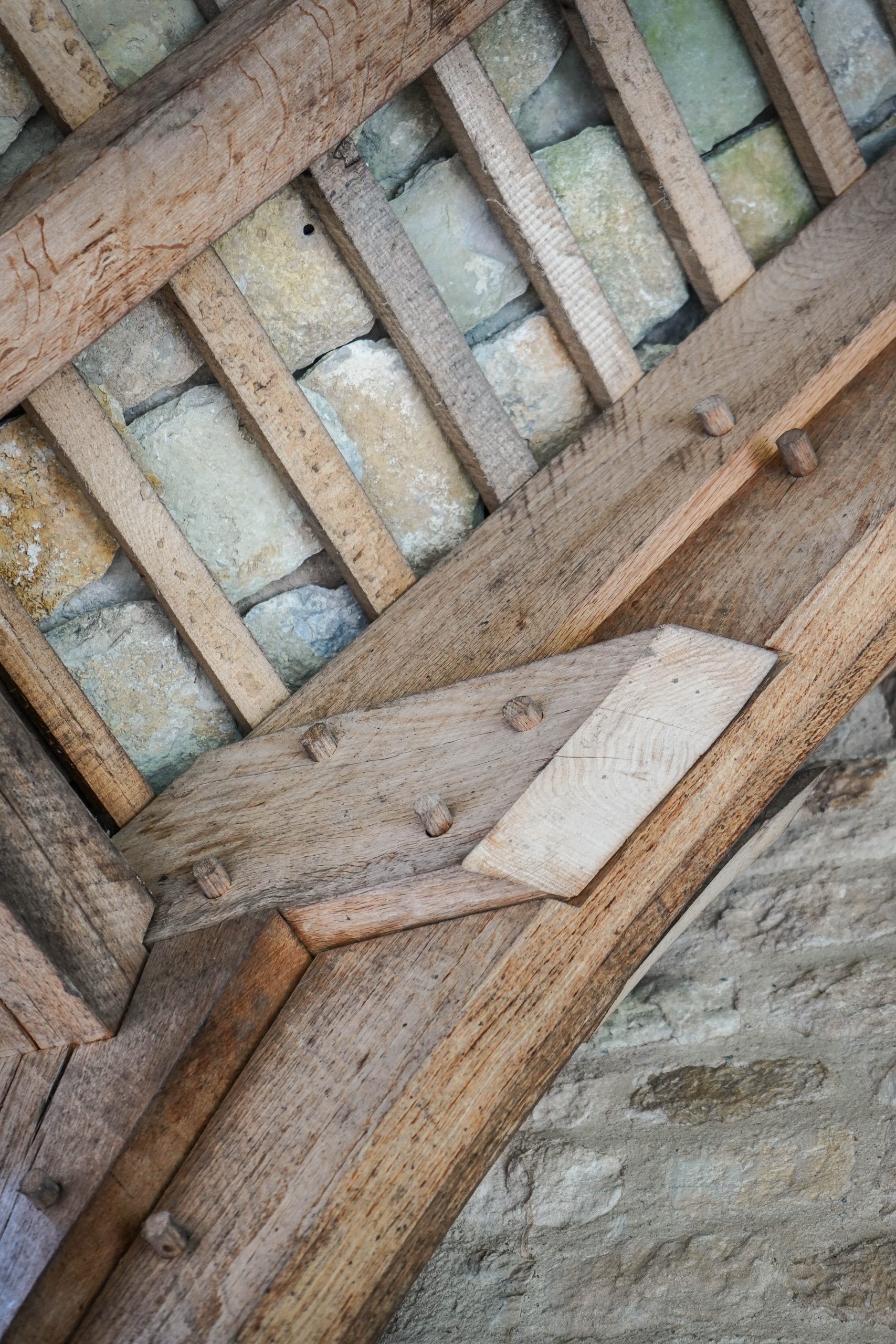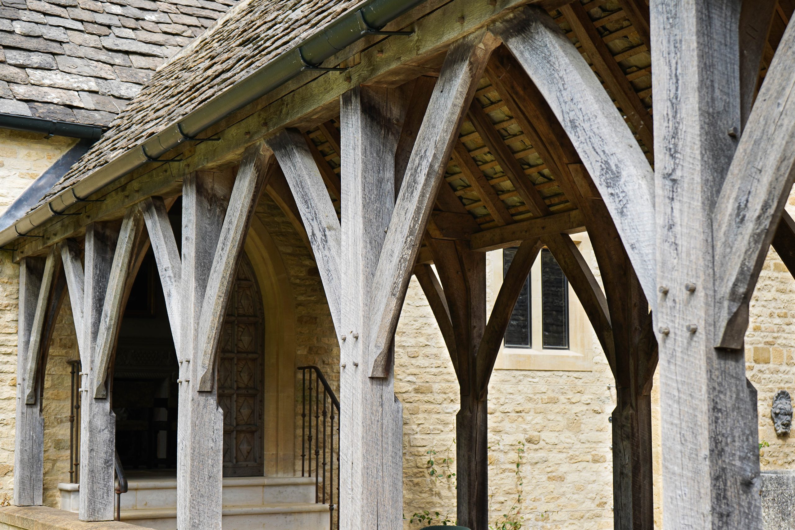 As part of a very long and careful restoration project TFCo designed, built and installed the beautiful oak frames to a new kitchen and dining room roof and cloister link between two parts of this unique historic medieval manor house. The oak was hand scrub planed to remove the modern band sawn surfaces and the frames are built with pegged traditional joints and historically appropriate detailing.